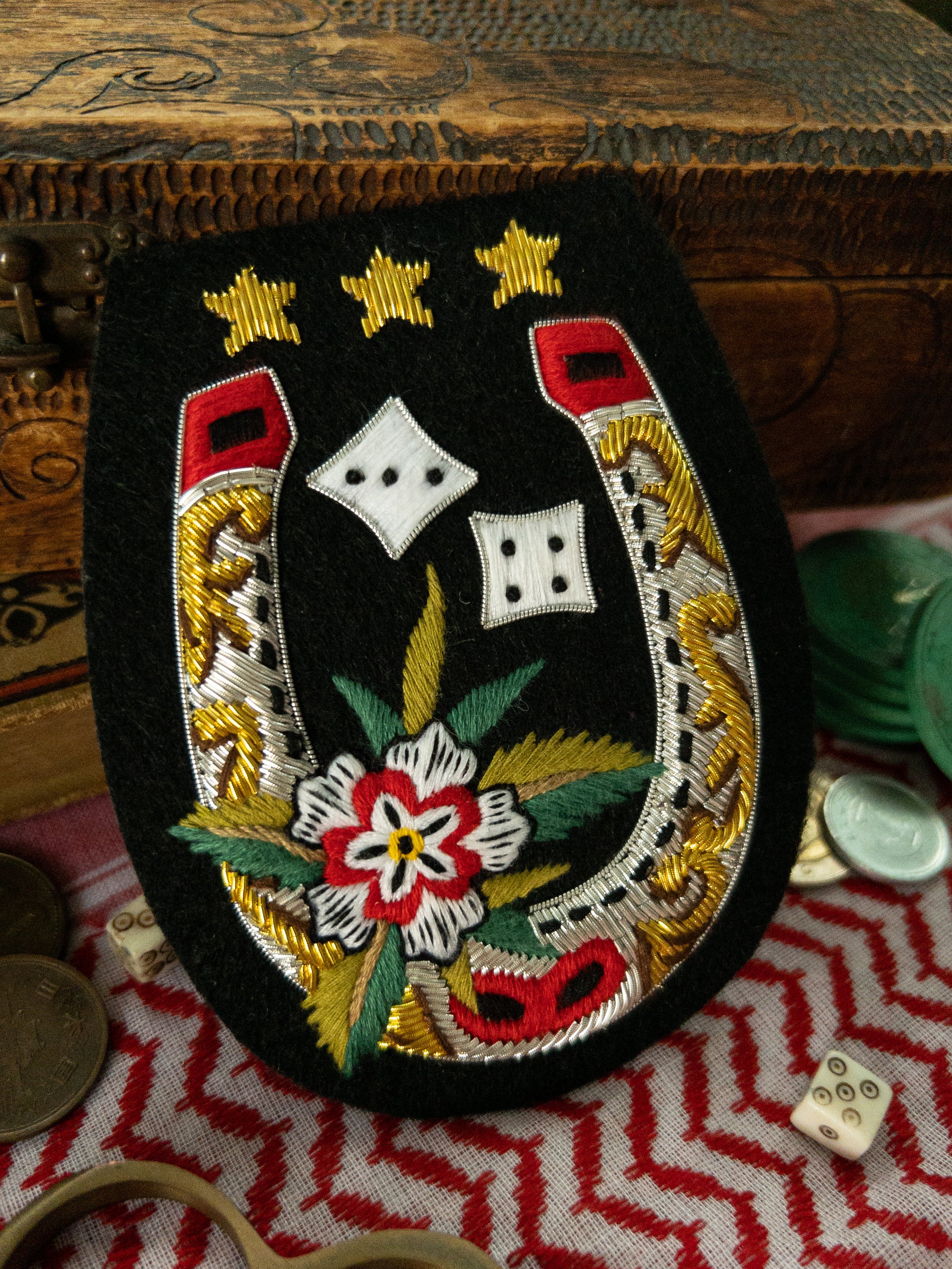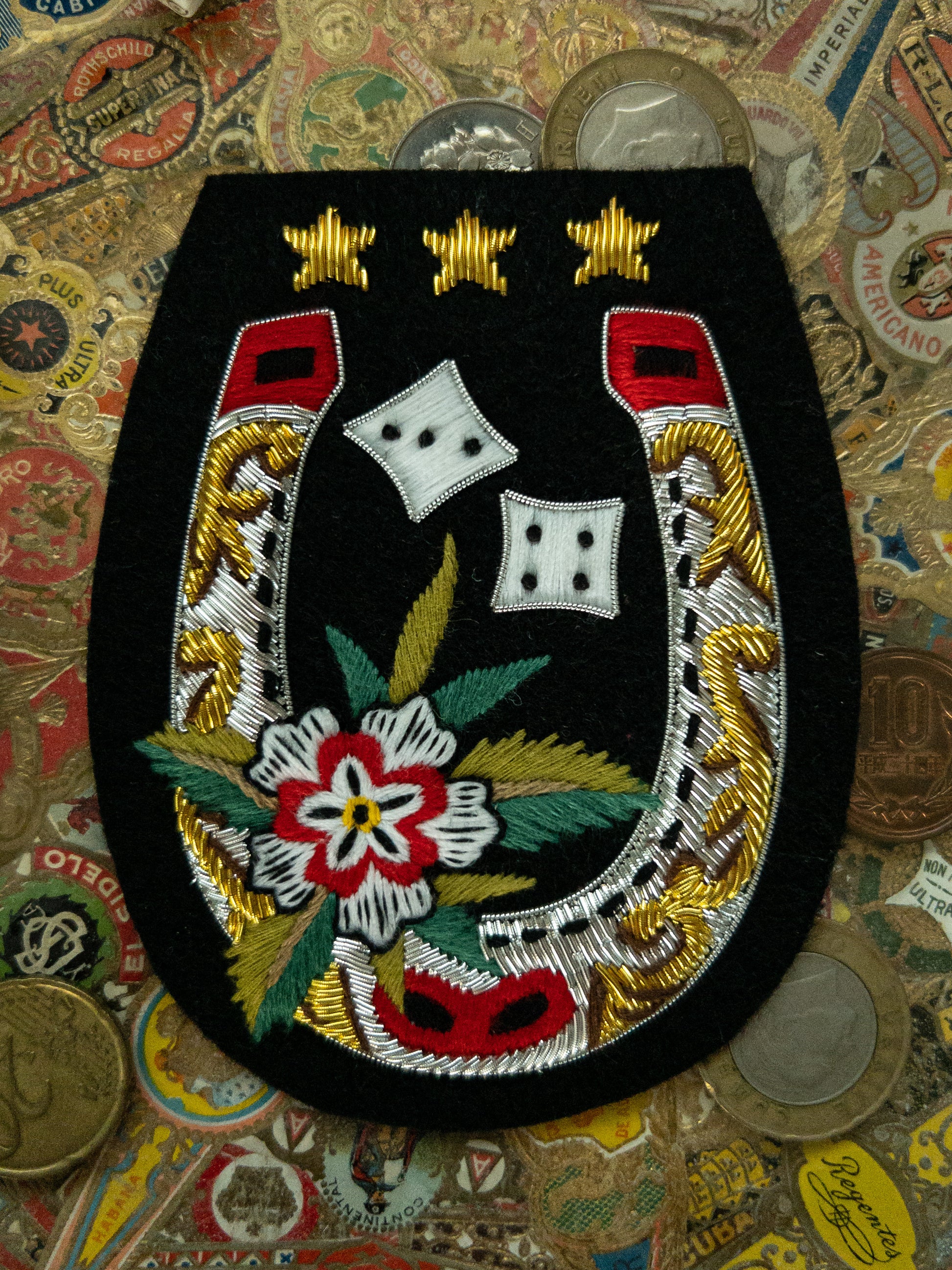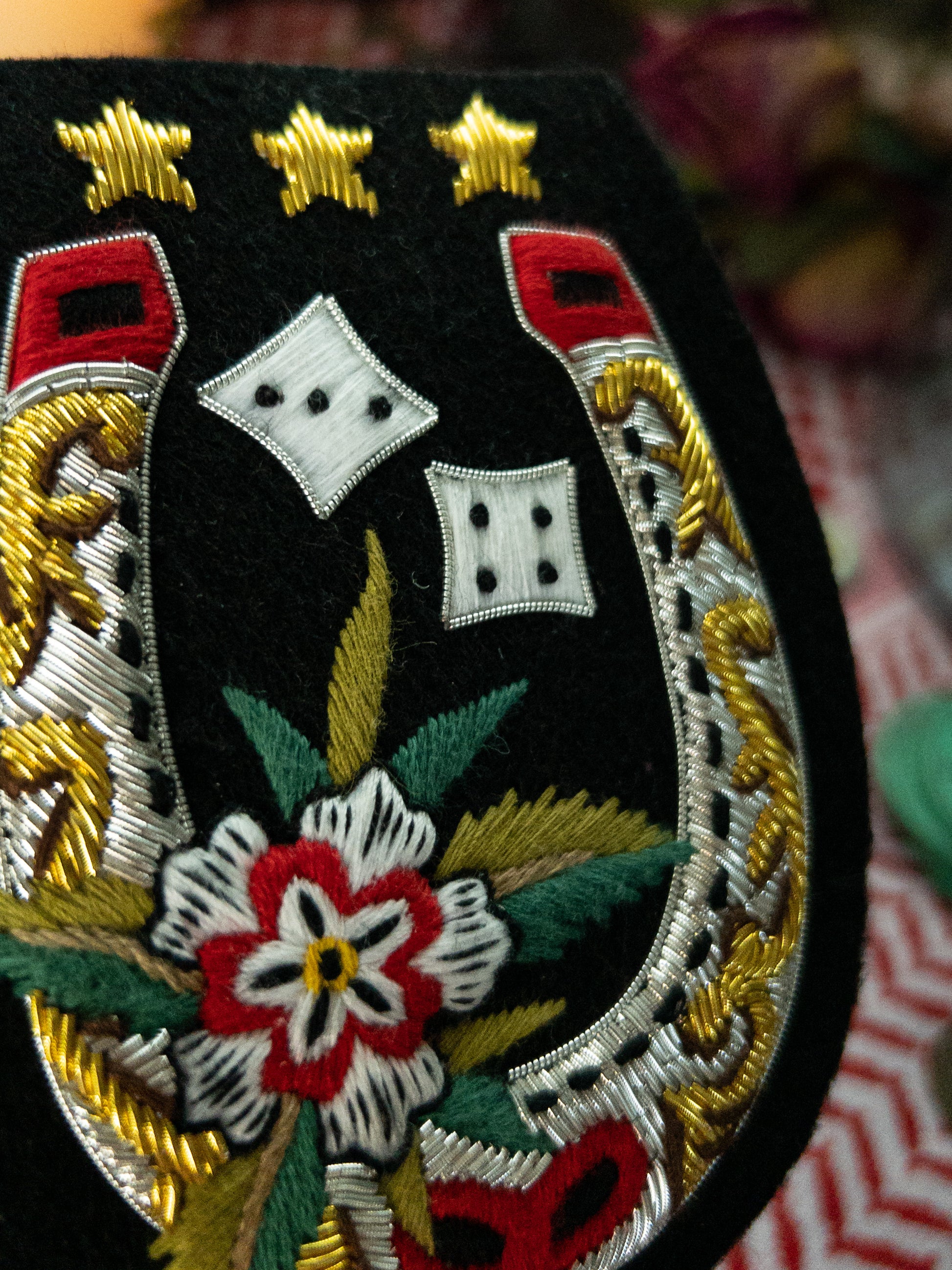 Material: Metallic bullion wire, thread, 100% cotton backing.