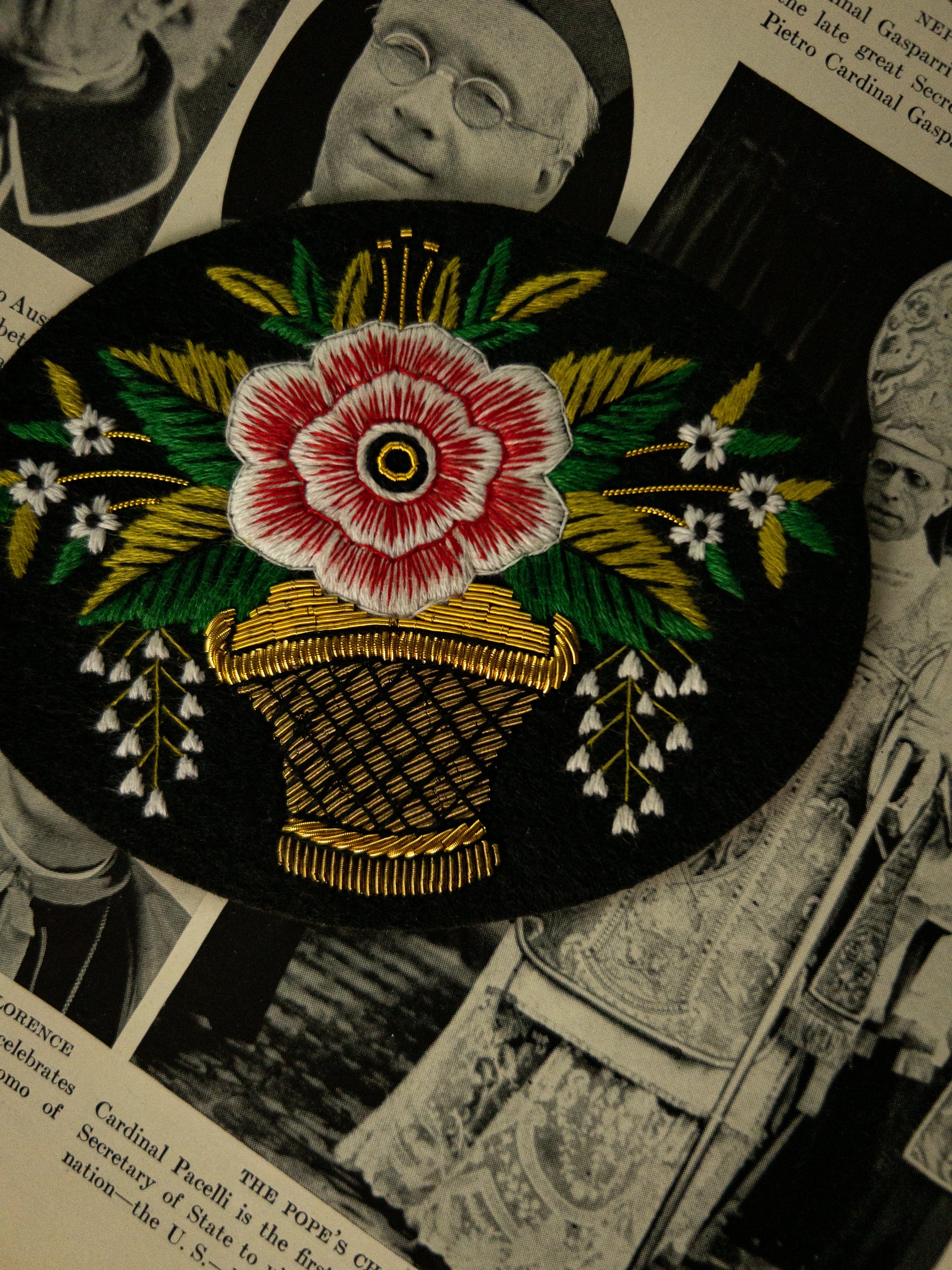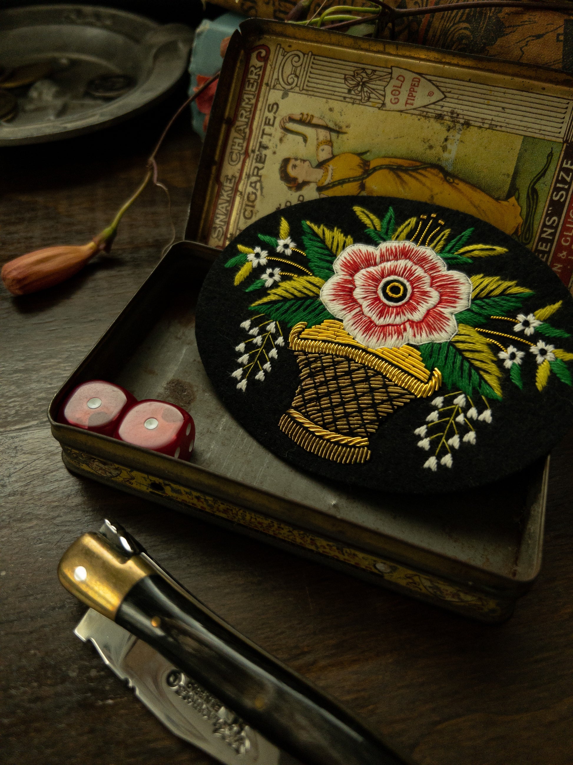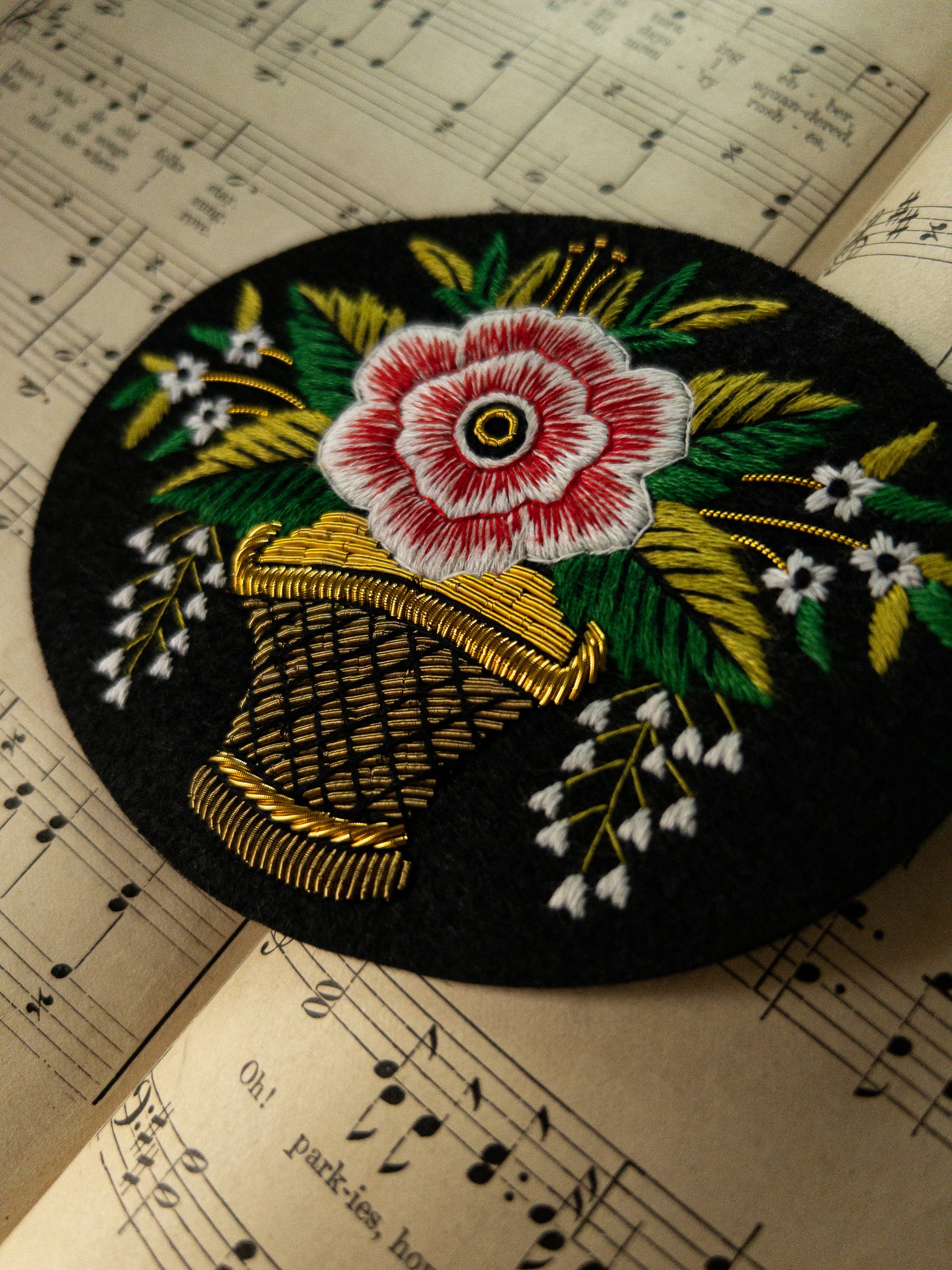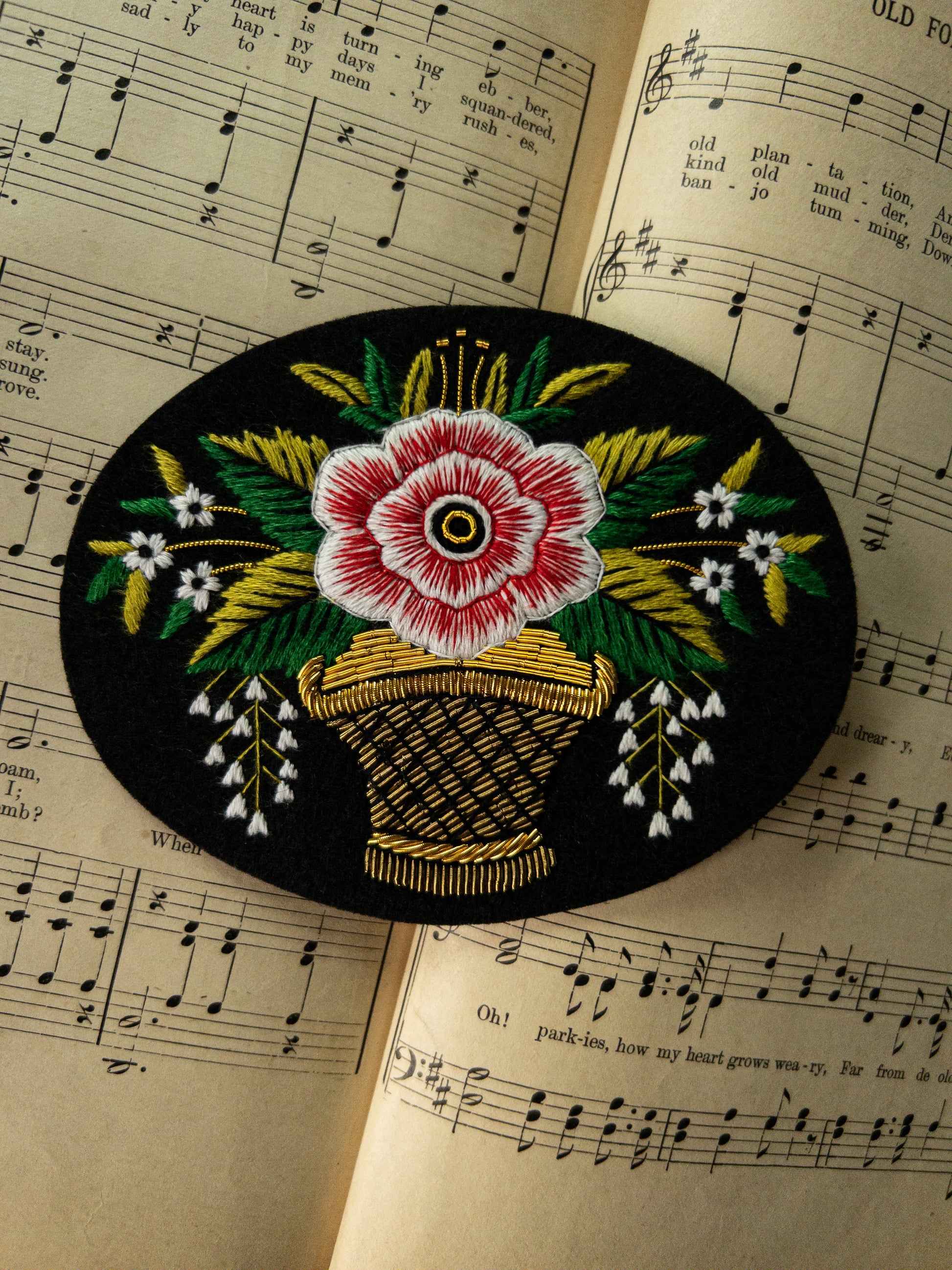 Material: Metallic bullion wire, thread, 100% cotton backing.